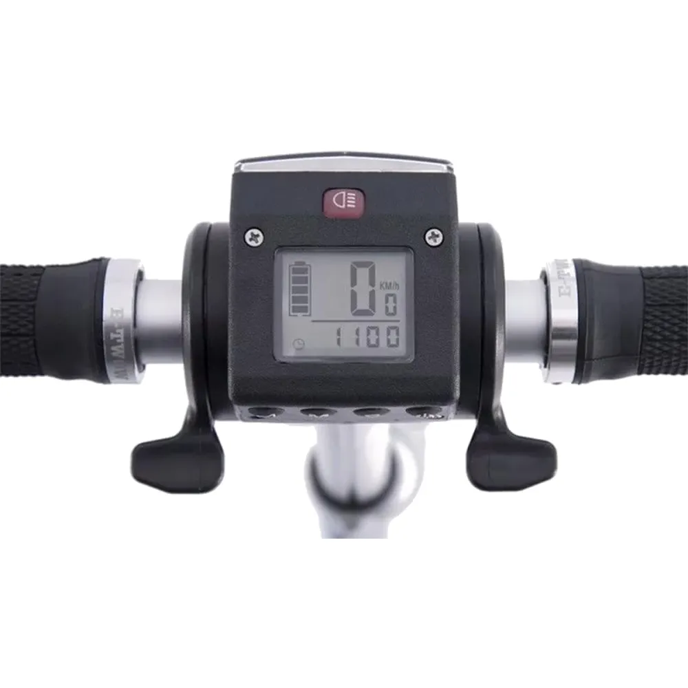 Электросамокат Generic E-twow S2 BOOSTER на рулевой стойке имеет светодиодную фару, информационный дисплей, на котором отражается скорость, заряд батареи, длительность хода.